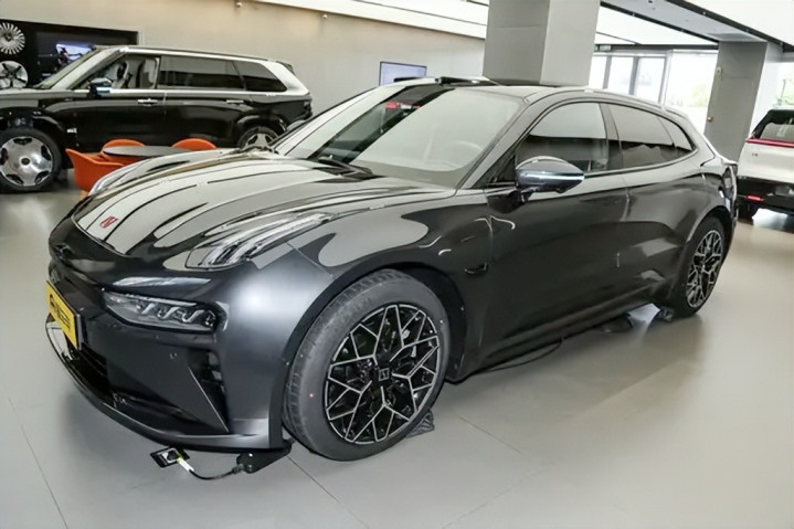 车身侧面仍然是001最迷人的角度。长车头、短前悬、长后悬的比例勾勒出典型的猎装姿态,整车线条从A柱开始顺滑下滑至尾部,既动感又优雅。隐藏式门把手、无框车门、悬浮车顶依旧保留,让车身表面干净利落。